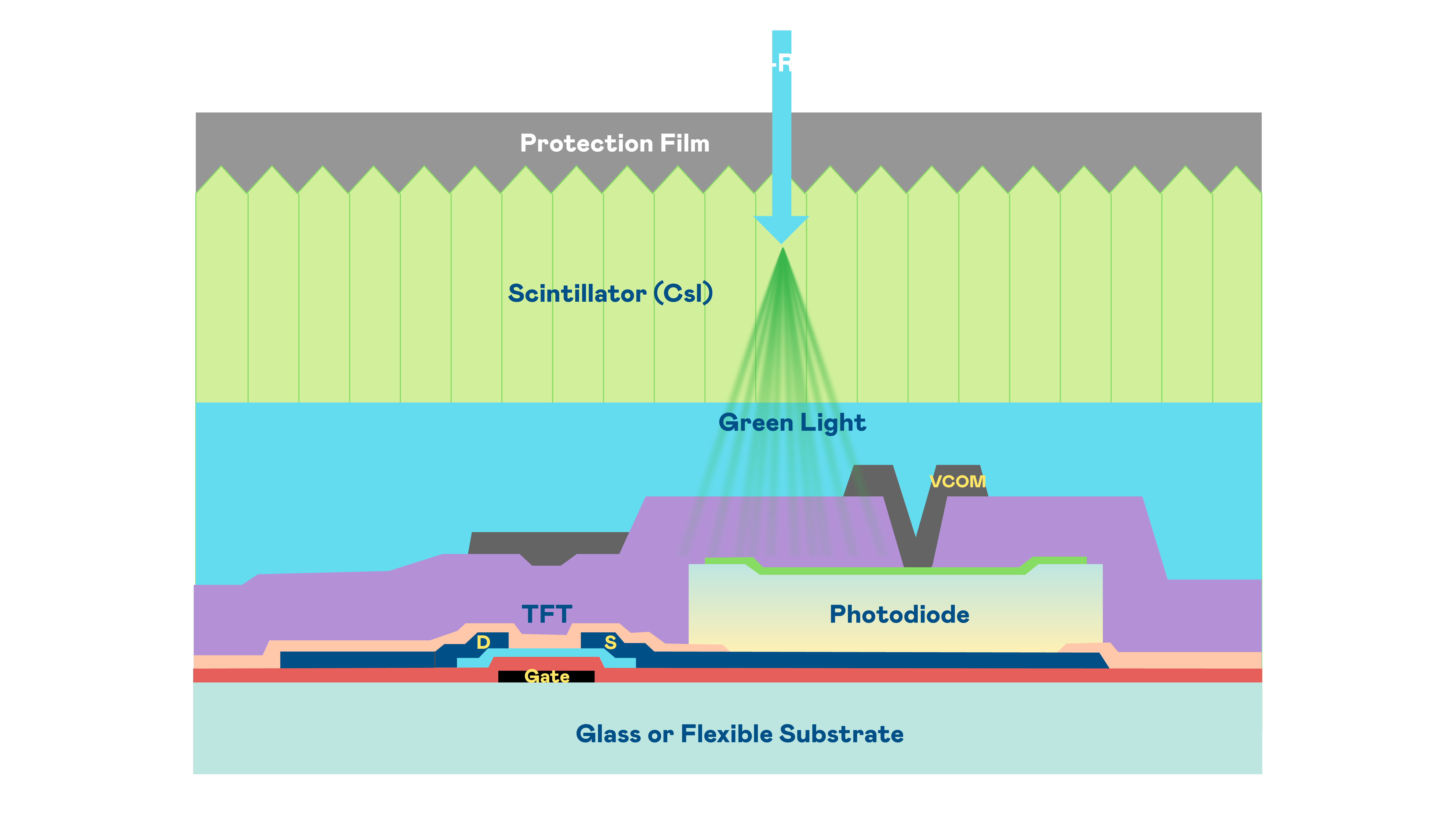 w66.利来旗舰厅的X光影像感测阵列使用薄膜电晶体 (TFT) 作为每个像素的读取开关,搭配光电二极体(Photodiode)的光电转换元件,用以感测X光影像讯号。